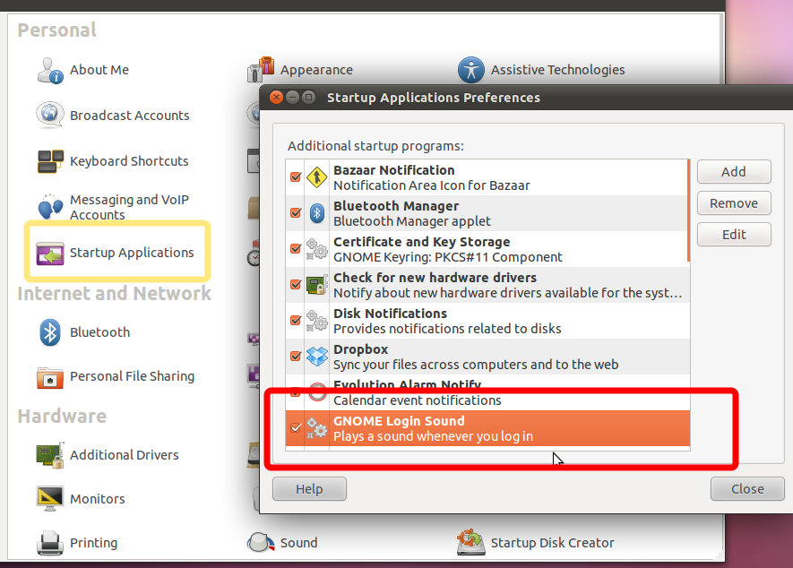 01 May 2011To get rid of the annoying pre login gdm ‘music’ in Ubuntu 11.04 just open the ‘Startup Applications’ from the Control Panel